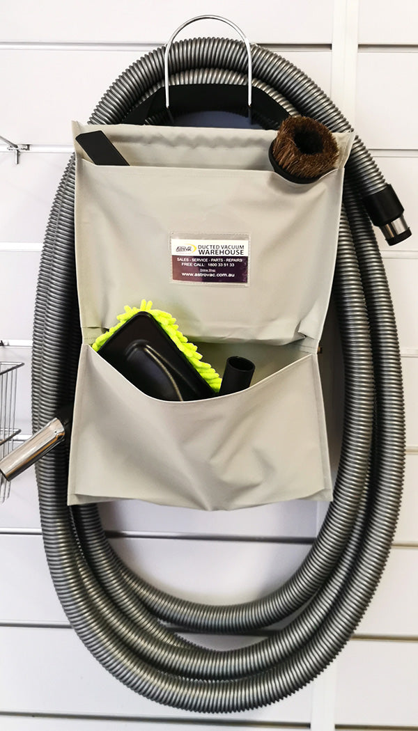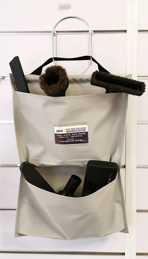 You can now store and organise your ducted vacuum tool kit in one convenient spot with the tool tidy / caddy bag. The 2 large pocket design allows room for most of your ducted vacuum tools and attachments. The tube bar is also inserted at the top to reinforce and strengthen the storage bag. A hanging loop used to hang the bag directly into the hose hanger bracket on the wall or back of the door.